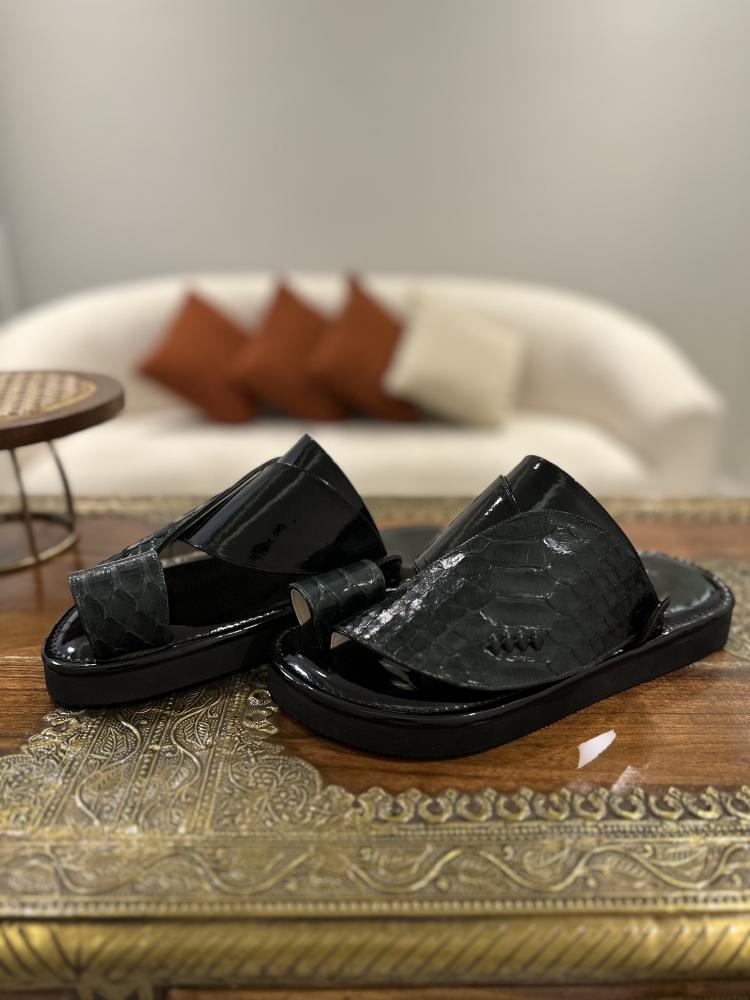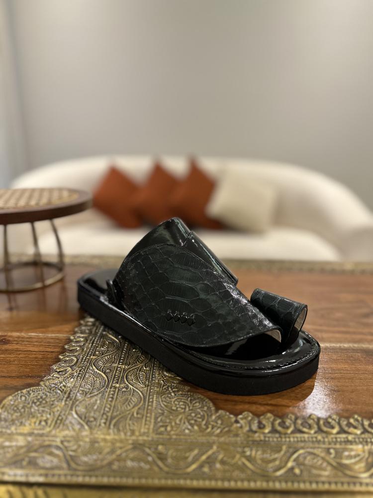 حذاء أسود لامع مع جلد ثعبان طبيعي زيتي غامق