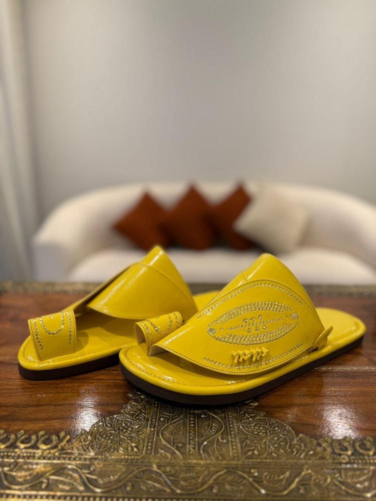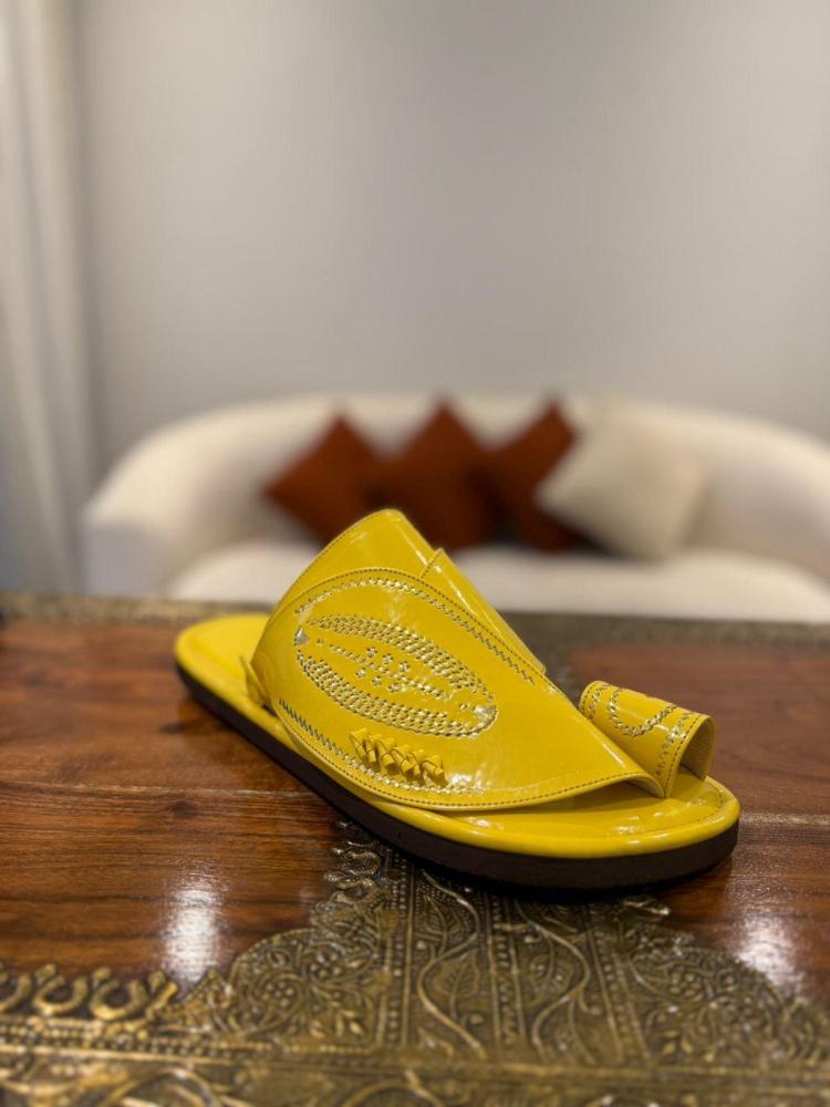 حذاء أصفر لامع تطريز يدوي زري ذهبي
